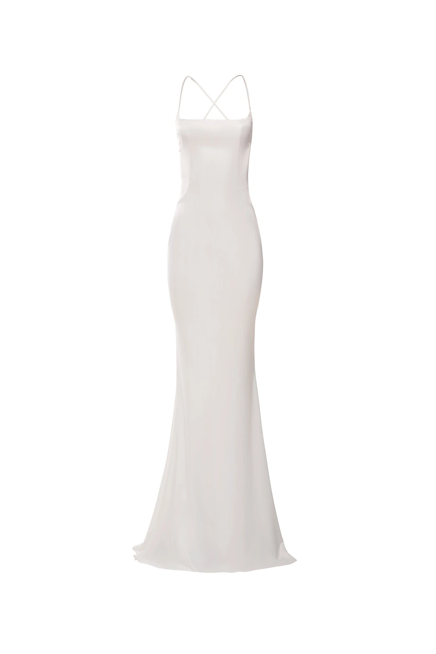 Designed to please the minimalists, the Harriet Gown features a straight neckline, dainty straps, and a fitted silhouette. Elevated with a lace-up back, this satin gown gives a simplistic approach to your evening edit.