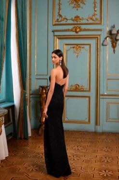 The Maureen Gown provides a glamorous appeal with its diamante accents & sequin fabric. Featuring an exposed bodice with geometric cut-outs, a side slit & halter neckline. This style was made to sit on the hips whilst falling to a straight silhouette.