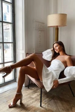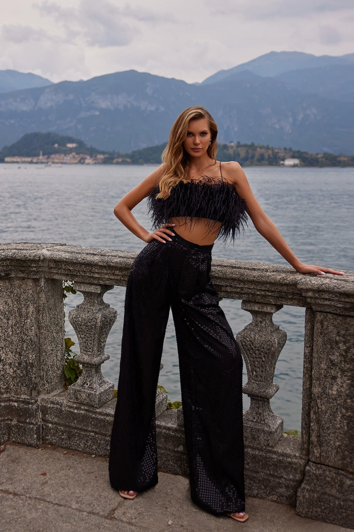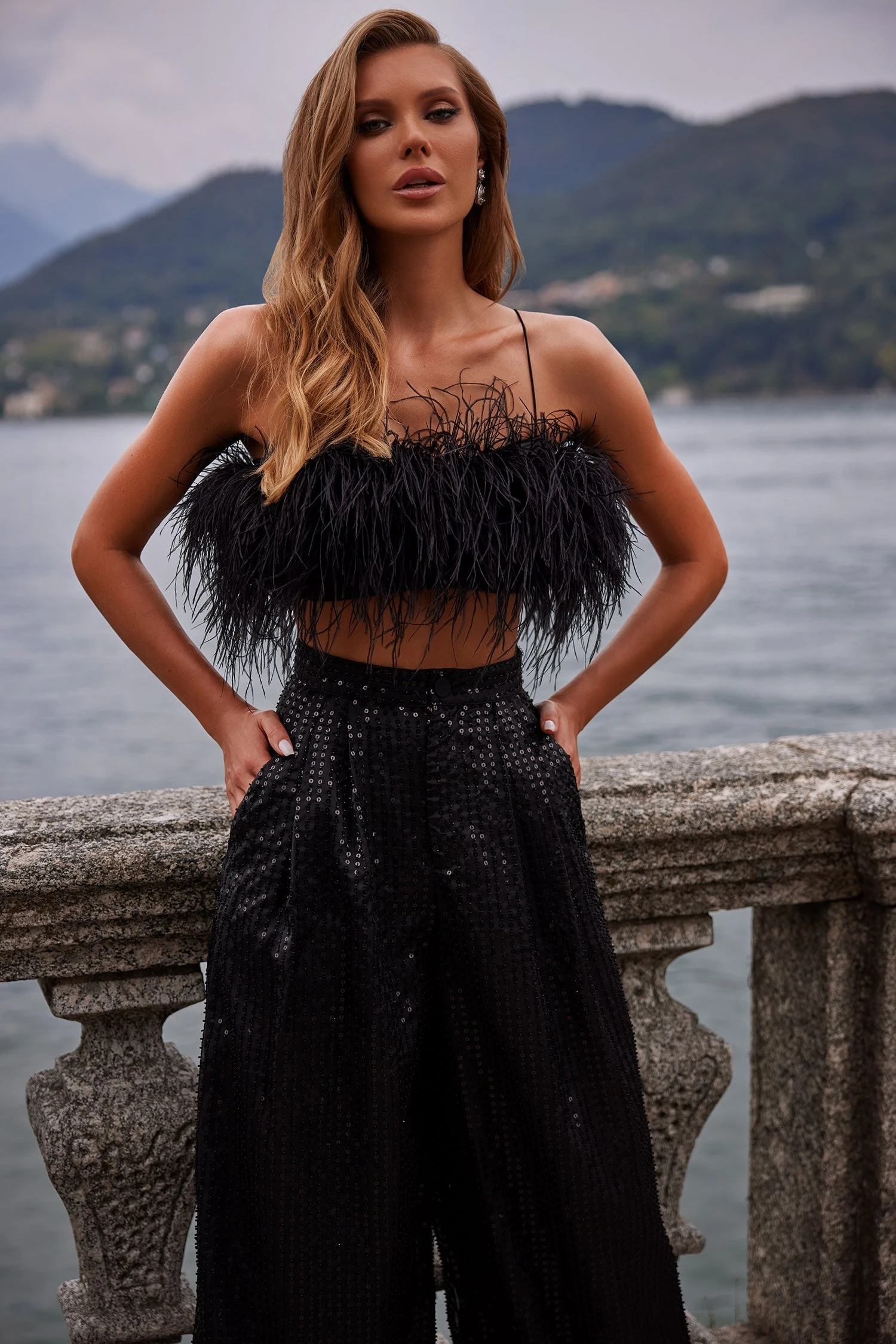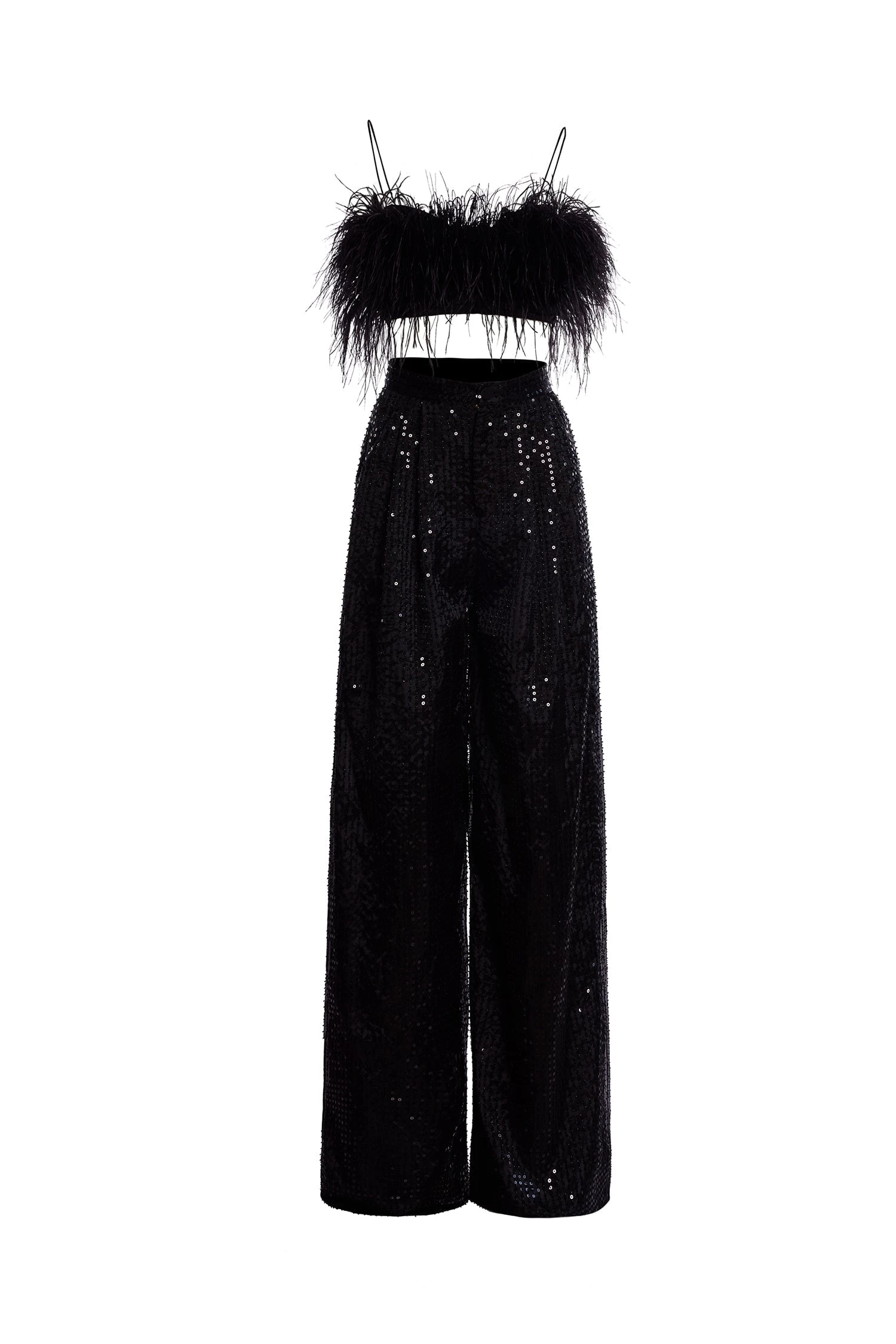 The Oberta Set is the epitome of maximalism with its feathered bustier & sequinned/beaded pant combination. Suspended from dainty straps and elevated with its oversized palazzo pant style, this look exudes glamour.