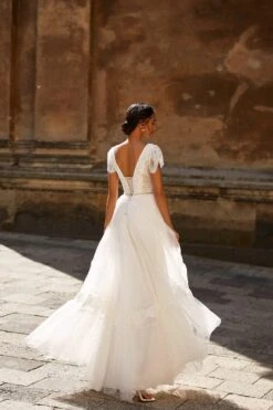 Matte satin fabric, Minimal stretch, A-line fit, Frill sleeves, Button-up back & sleeves, Lined.Â
