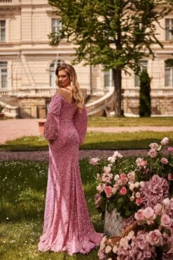 Semi-sheer beaded glitter fabric, lined with nude mesh, no cups, zip back, diamante embellished waist ties, stretchy skirt, back slit, elastic waistband in skirt.