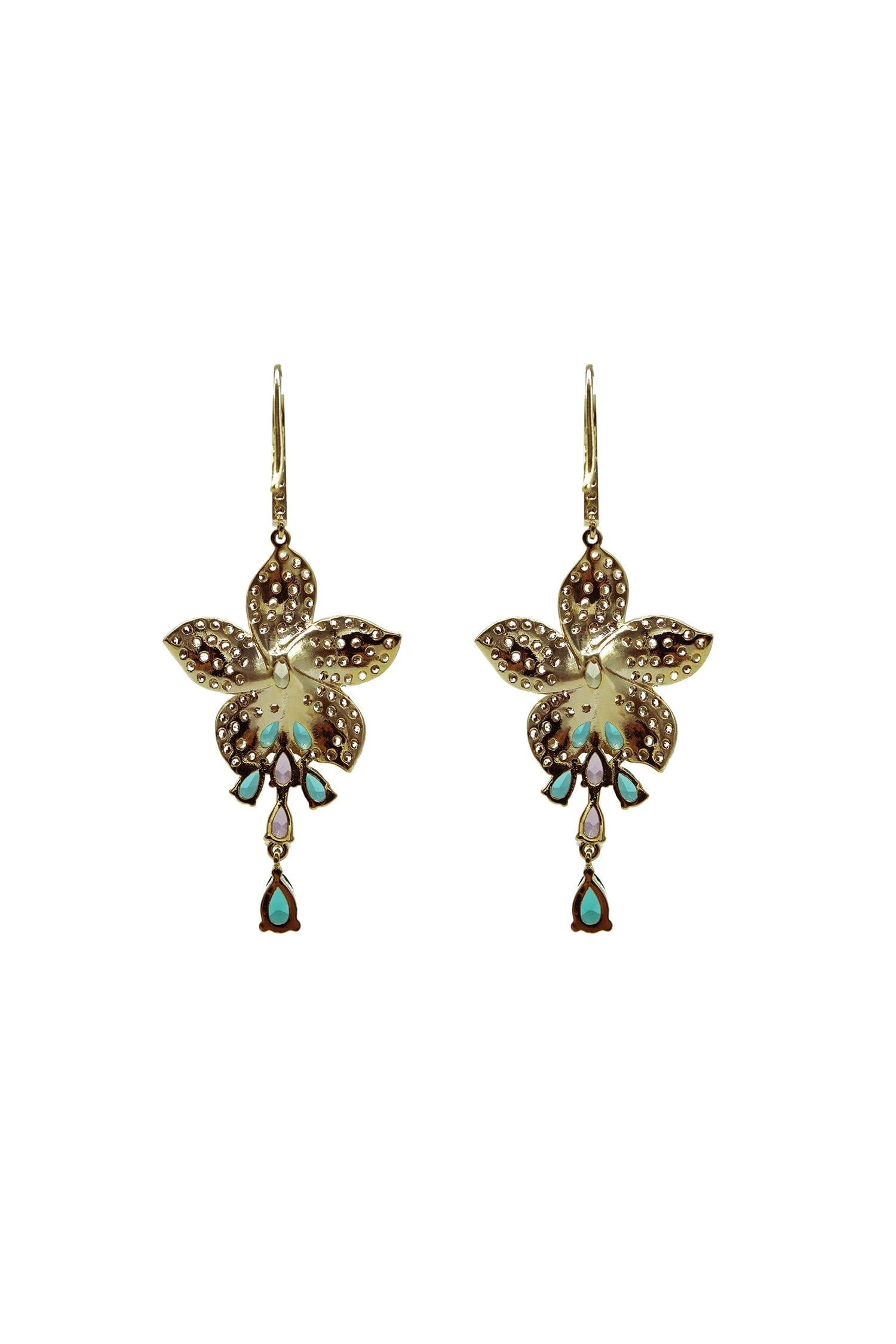 The Suzette Earrings are simply elegant. These statement flower earrings are adorned with teal, yellow & pink gems with encrusted diamantes for a luxurious appeal.Â